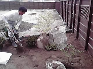この庭の仕上げは自然石の回りにコケを植えて、後から山砂でホウキ目をつけます。