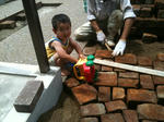 アプローチのレンガ敷きの目地入れを入れてくれてるHさんのご長男です。